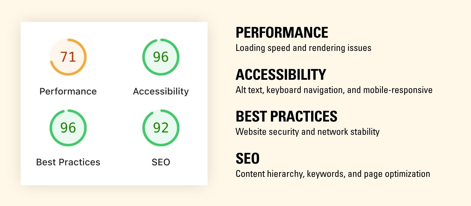 A lightweight “score” from one tool is not enough. A strong audit should include both data and human review. At minimum, it should cover these areas: